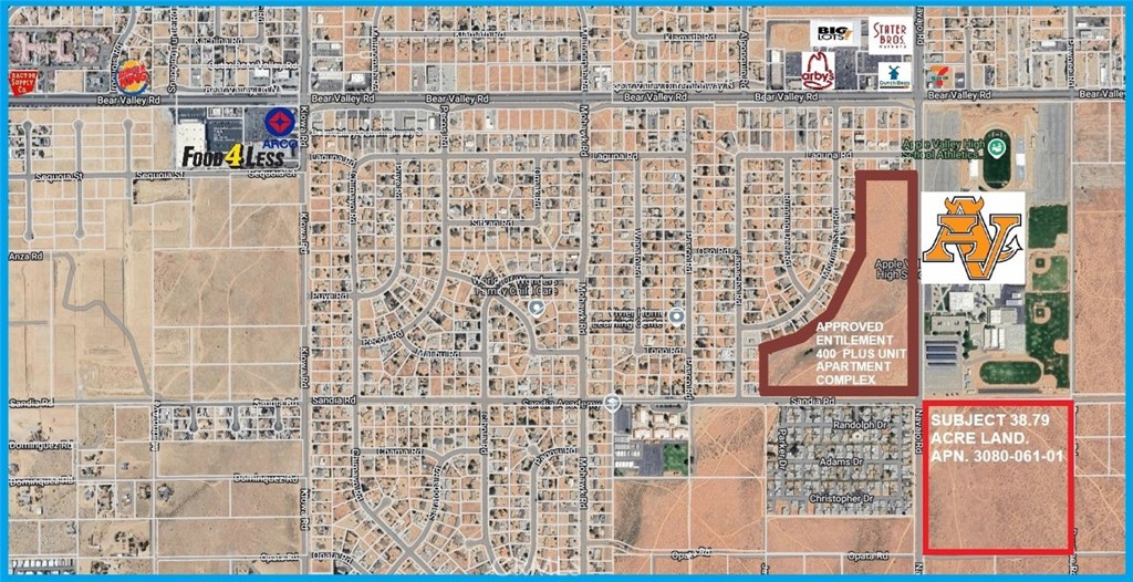 PRIME 38.79 ACRE OF CORNER LOT!! Only 1 block 1 block south of signalized intersection Bear Valley Rd and Navajo Rd where Stater Bros. Shopping center located along with Big Lots, Dutch Bros Coffee, Jack in The Box, Arby’s, Subway, Nick’s Pizza, 7/11 and many other businesses. FLEXIBLE ZONING (Please check with Town of Apple Valley). Town of Apple Valley just approved a 400 plus unit apartment complex right across the land for another developer. An excellent opportunity to develop this prime piece of property. MOTIVATED SELLER MIGHT BE OPEN TO SELLER FINANCING WITH 50% DOWN AT REASONABLE INTEREST RATE!! Submit your offer today!!